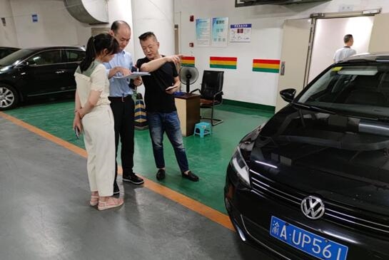 檢查組與江南分中心值班人員檢查工程車輛停放情況