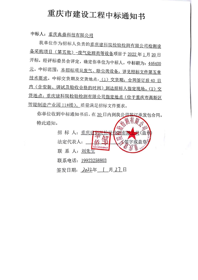 重慶建科院檢驗檢測有限公司委托重慶市工程管理有限公司對我公司檢測設(shè)備采購項目(項目號:CQEM-ZB-22002 )重慶建科院檢驗檢測有限公司檢測設(shè)備采購項目(第五批)-廢氣處理類等設(shè)備進(jìn)行了公開招標(biāo)采購,現(xiàn)已完成全部采購程序。確認(rèn)重慶典鼎科技有限公司為檢測設(shè)備采購項目(第五批)-廢氣處理類等設(shè)備采購項目中標(biāo)人,中標(biāo)價為446400元(大寫:肆拾肆萬陸仟肆佰元整)。