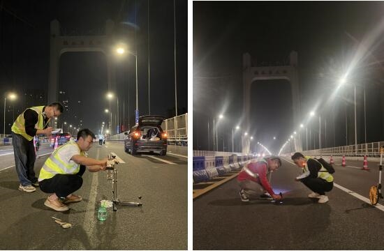 鵝公巖長江大橋是重慶主城區(qū)橫跨長江連接九龍坡區(qū)和南岸區(qū)的重要特大橋梁,是快速抵達(dá)成渝高速和渝黔高速的主要通道,大橋?yàn)殡p向八車道,于2000年12月建成通車。近年來,隨著車流量急速增長及重車通行,橋面瀝青鋪裝層產(chǎn)生較多病害,可能影響使用壽命。為全面掌握橋面鋪裝層病害狀況,檢測(cè)中心選派豐富經(jīng)驗(yàn)的檢測(cè)人員提前收集項(xiàng)目資料,協(xié)商交通組織方案并編制檢測(cè)方案,保證任務(wù)順利開展。全體檢測(cè)人員高度重視夜間工作的安全問題,布設(shè)大量交通導(dǎo)行標(biāo)牌、施工限速標(biāo)志等交通設(shè)施,全員穿反光背心、佩戴安全警示燈進(jìn)行病害分布、平整度、摩擦系數(shù)、構(gòu)造深度等指標(biāo)的檢測(cè),確保數(shù)據(jù)的真實(shí)性和準(zhǔn)確性。最終檢測(cè)數(shù)據(jù)和狀況評(píng)估以報(bào)告編制工作會(huì)的形式發(fā)布,為鋪裝層病害專項(xiàng)整治專項(xiàng)設(shè)計(jì)提供了技術(shù)依據(jù),為后續(xù)的橋面鋪裝層病害整治方案制定提供了科學(xué)支撐。