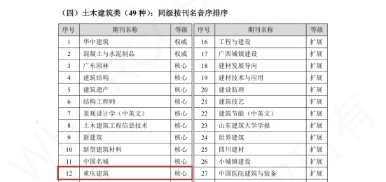 《報(bào)告》顯示,首次發(fā)布的評(píng)價(jià)結(jié)果中,“土木建筑類”應(yīng)用型期刊合計(jì)49本,其中2本“權(quán)威”,10本“核心”。《重慶建筑》入選“核心”期刊,按音序排第12位。